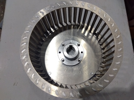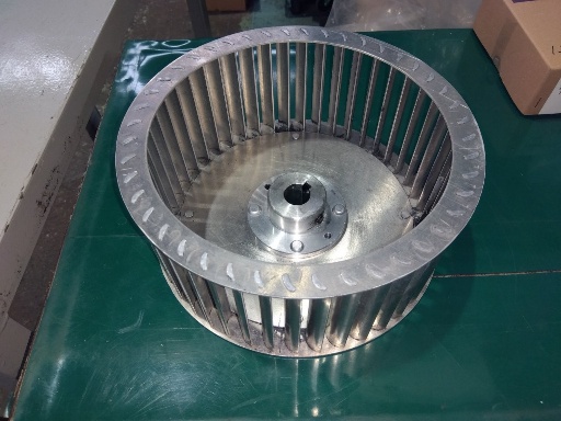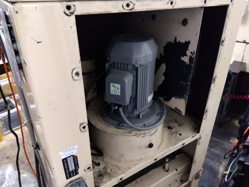 改造にあたっては、既存のモーターとシャフト径や取付寸法が異なるため、羽根車(インペラ)のボス穴加工および新規取付板の製作を実施。精密な組み付けと試運転を経て、集塵機本体へ取り付けました。